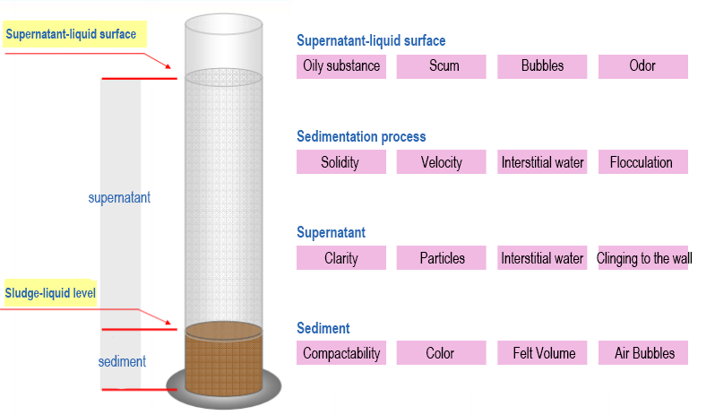 | स्पष्टता | कुल मिलाकर क्रोमा (रंग) और मैलापन। | 1. लोड स्तर (जितना अधिक, उतना बुरा); 2. वातन की डिग्री (अत्यधिक वातन खराब स्पष्टता की ओर ले जाता है); 3. क्या कीचड़ जहरीला है (जहरीले कीचड़ के परिणामस्वरूप खराब स्पष्टता होती है); 4. फिलामेंटस बल्किंग (स्पष्ट)। |