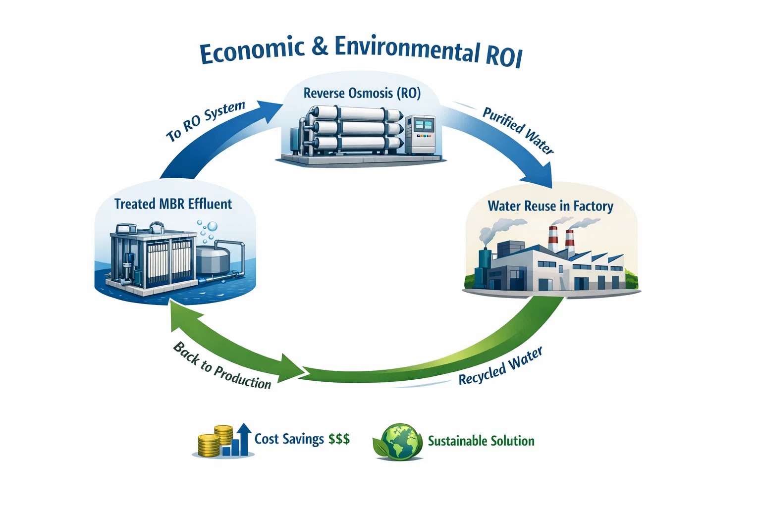 - बचत: 70-80% प्रक्रिया जल का पुनर्चक्रण करके, पौधे जल खरीद और निर्वहन शुल्क में सालाना सैकड़ों हजारों डॉलर बचा सकते हैं।