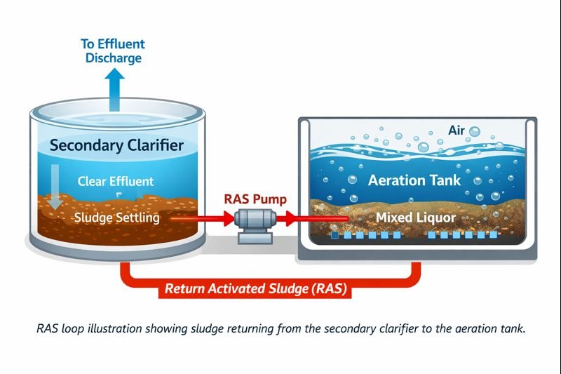 आरएएस (रिटर्न एक्टिवेटेड स्लज) का उपयोग जैविक रिएक्टर में आवश्यक बायोमास एकाग्रता को बनाए रखने, स्थिर उपचार प्रदर्शन सुनिश्चित करने के लिए किया जाता है।